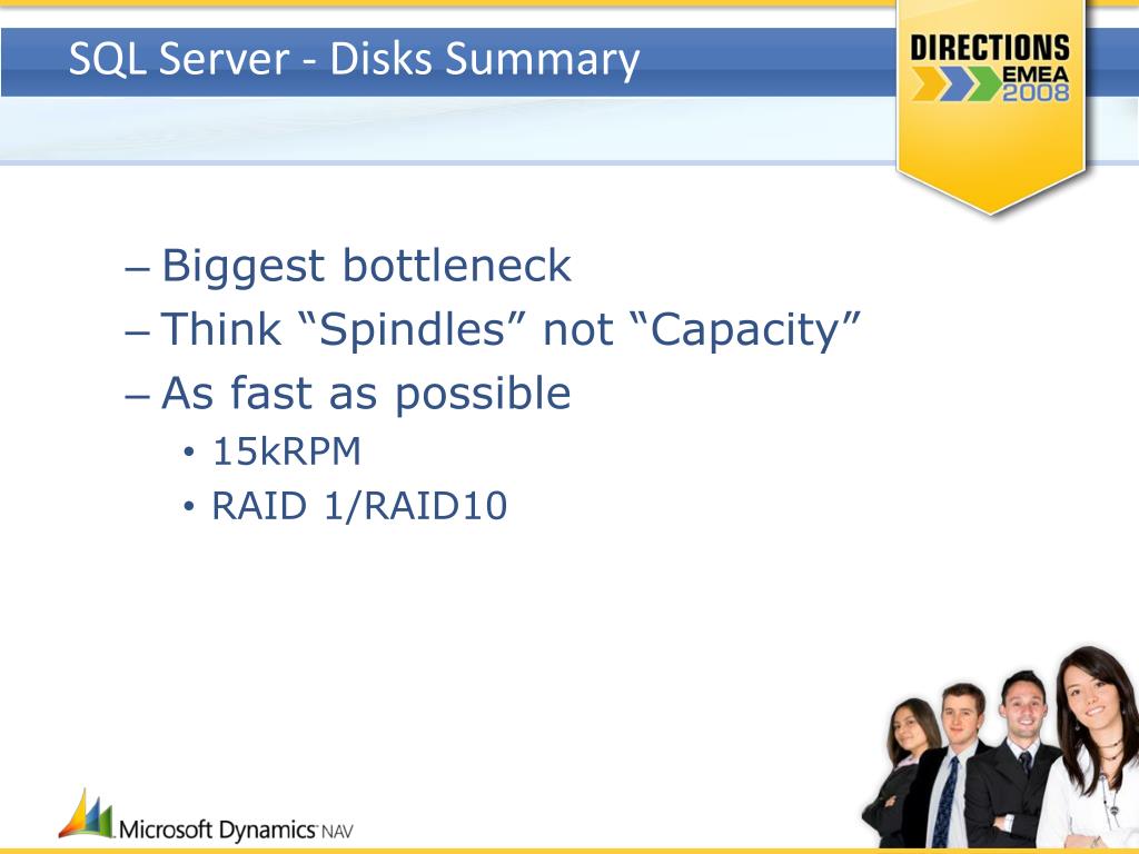 SQL Server - Disks Summary • Biggest bottleneck • Think “Spindles” not “Capacity” • As fast as possible • 15kRPM • RAID 1/RAID10