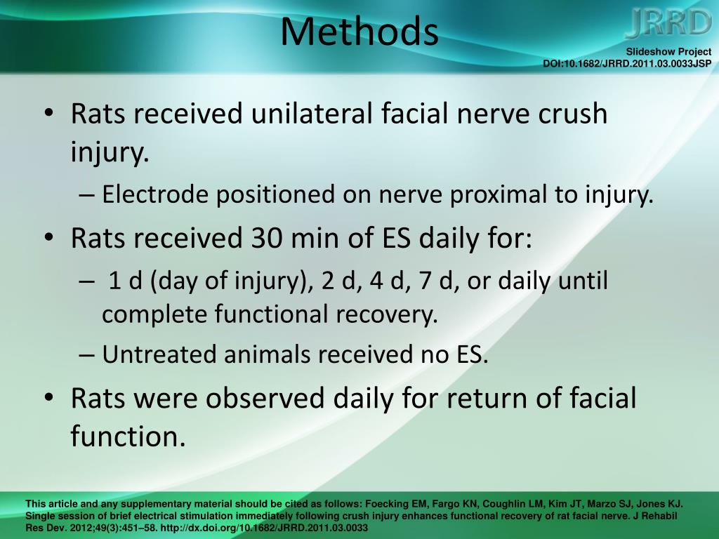 Methods • Rats received unilateral facial nerve crush injury. • Electrode positioned on nerve proximal to injury. • Rats received 30 min of ES daily for: • 1 d (day of injury), 2 d, 4 d, 7 d, or daily until complete functional recovery. • Untreated animals received no ES. • Rats were observed daily for return of facial function.