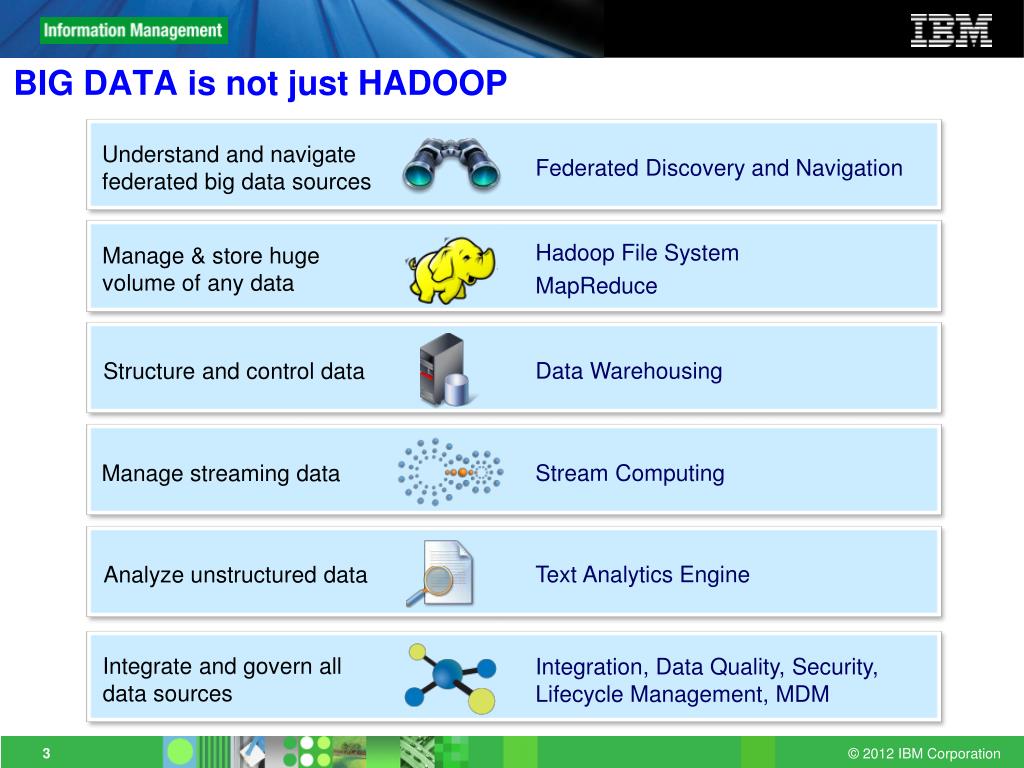 BIG DATA is not just HADOOP Understand and navigate federated big data sources Federated Discovery and Navigation Hadoop File System MapReduce Manage & store huge volume of any data Data Warehousing Structure and control data Stream Computing Manage streaming data Text Analytics Engine Analyze unstructured data Integrate and govern all data sources Integration, Data Quality, Security, Lifecycle Management, MDM