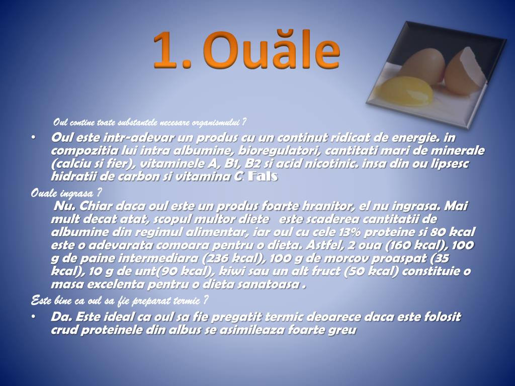 Ouăle Oul contine toate substantele necesare organismului ? • Oul este intr-adevar un produs cu un continut ridicat de energie. in compozitia lui intra albumine, bioregulatori, cantitati mari de minerale (calciu si fier), vitaminele A, B1, B2 si acid nicotinic. insa din ou lipsesc hidratii de carbon si vitamina C. Fals Oualeingrasa ?Nu. Chiar daca oul este un produs foarte hranitor, el nu ingrasa. Mai mult decatatat, scopul multor diete este scadereacantitatii de albumine din regimul alimentar, iar oul cu cele 13% proteine si 80 kcal este o adevarata comoara pentru o dieta. Astfel, 2 oua (160 kcal), 100 g de paine intermediara (236 kcal), 100 g de morcov proaspat (35 kcal), 10 g de unt(90 kcal), kiwi sau un alt fruct (50 kcal) constituie o masa excelenta pentru o dieta sanatoasa . Este bine ca oul sa fie preparat termic ? • Da. Este ideal ca oul sa fie pregatit termic deoarece daca este folosit crud proteinele din albus se asimileaza foarte greu