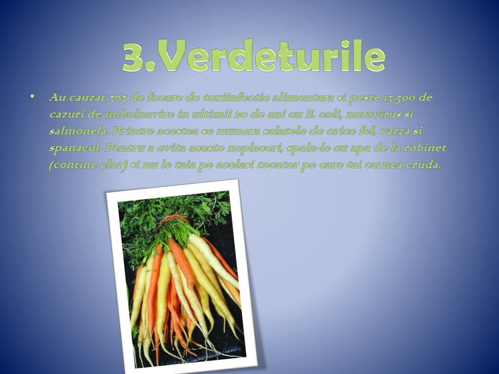 3.Verdeturile • Au cauzat 363 de focare de toxiinfectie alimentara si peste 13.500 de cazuri de imbolnavire in ultimii 20 de ani cu E. coli, norovirus si salmonela. Printre acestea se numara salatele de orice fel, varza si spanacul. Pentru a evita aceste neplaceri, spala-le cu apa de la robinet (contine clor) si nu le taia pe acelasitocatorpe care tai carnea cruda.