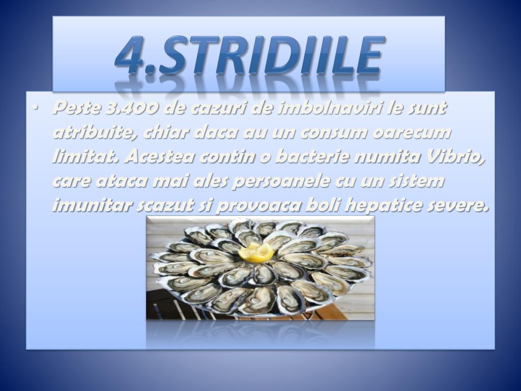 4.Stridiile • Peste 3.400 de cazuri de imbolnaviri le sunt atribuite, chiar daca au un consum oarecum limitat. Acestea contin o bacterie numita Vibrio, care ataca mai ales persoanele cu un sistem imunitar scazut si provoaca boli hepatice severe.