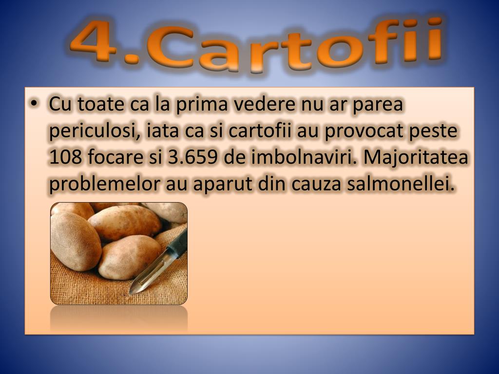 4.Cartofii • Cu toate ca la prima vedere nu ar pareapericulosi, iata ca si cartofii au provocat peste 108 focare si 3.659 de imbolnaviri. Majoritatea problemelor au aparut din cauza salmonellei.