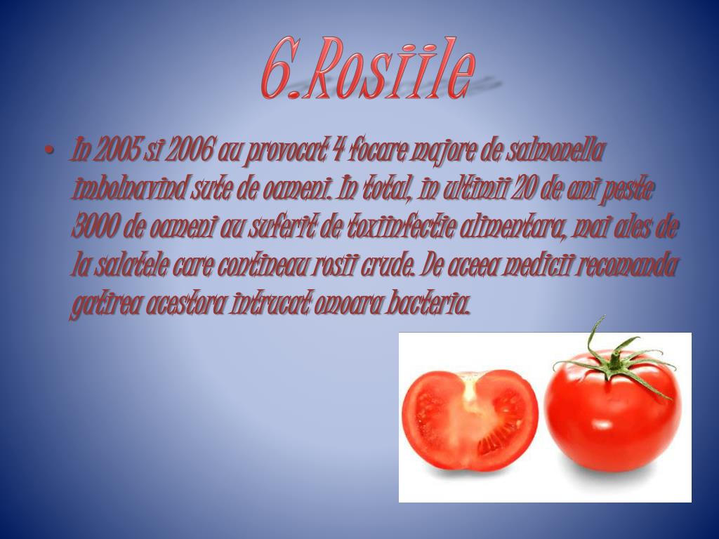 6.Rosiile • In 2005 si 2006 au provocat 4 focare majore de salmonella imbolnavind sute de oameni. In total, in ultimii 20 de ani peste 3000 de oameni au suferit de toxiinfectie alimentara, mai ales de la salatele care contineaurosii crude. De aceea medicii recomanda gatirea acestora intrucatomoara bacteria.
