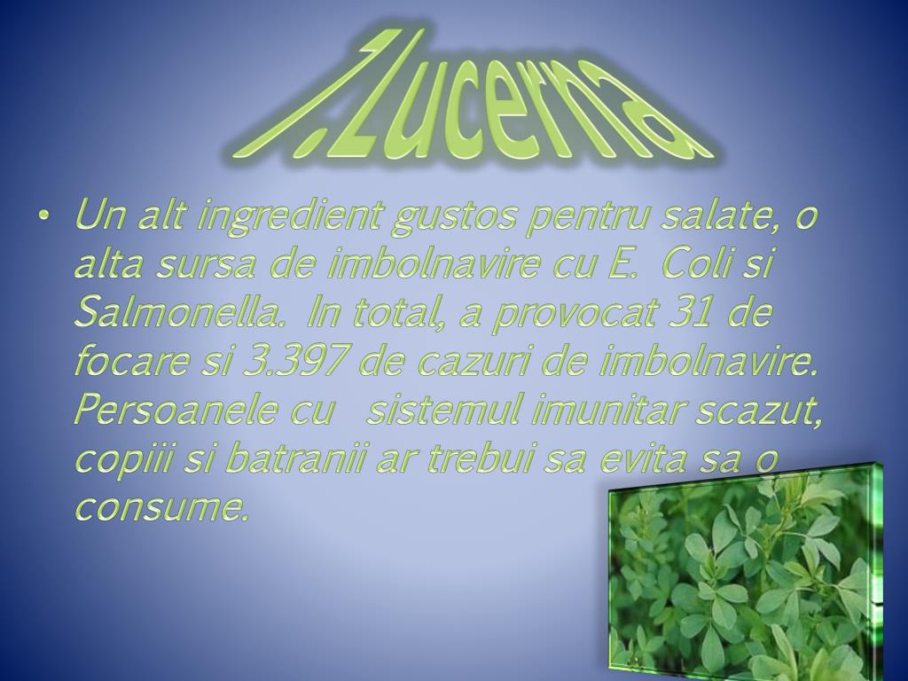 7.Lucerna • Un alt ingredient gustos pentru salate, o alta sursa de imbolnavire cu E. Coli si Salmonella. In total, a provocat 31 de focare si 3.397 de cazuri de imbolnavire. Persoanele cu sistemul imunitar scazut, copiii si batranii ar trebui sa evita sa o consume.