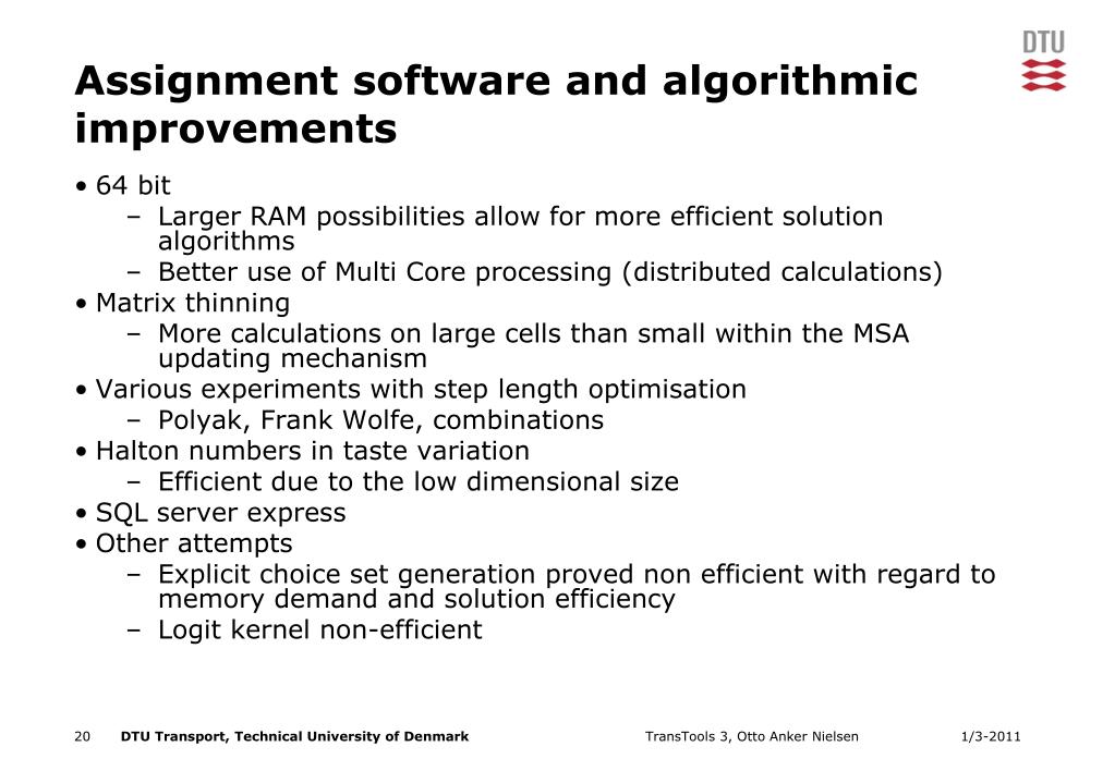 Assignment software and algorithmic improvements • 64 bit • Larger RAM possibilities allow for more efficient solution algorithms • Better use of Multi Core processing (distributed calculations) • Matrix thinning • More calculations on large cells than small within the MSA updating mechanism • Various experiments with step length optimisation • Polyak, Frank Wolfe, combinations • Halton numbers in taste variation • Efficient due to the low dimensional size • SQL server express • Other attempts • Explicit choice set generation proved non efficient with regard to memory demand and solution efficiency • Logit kernel non-efficient