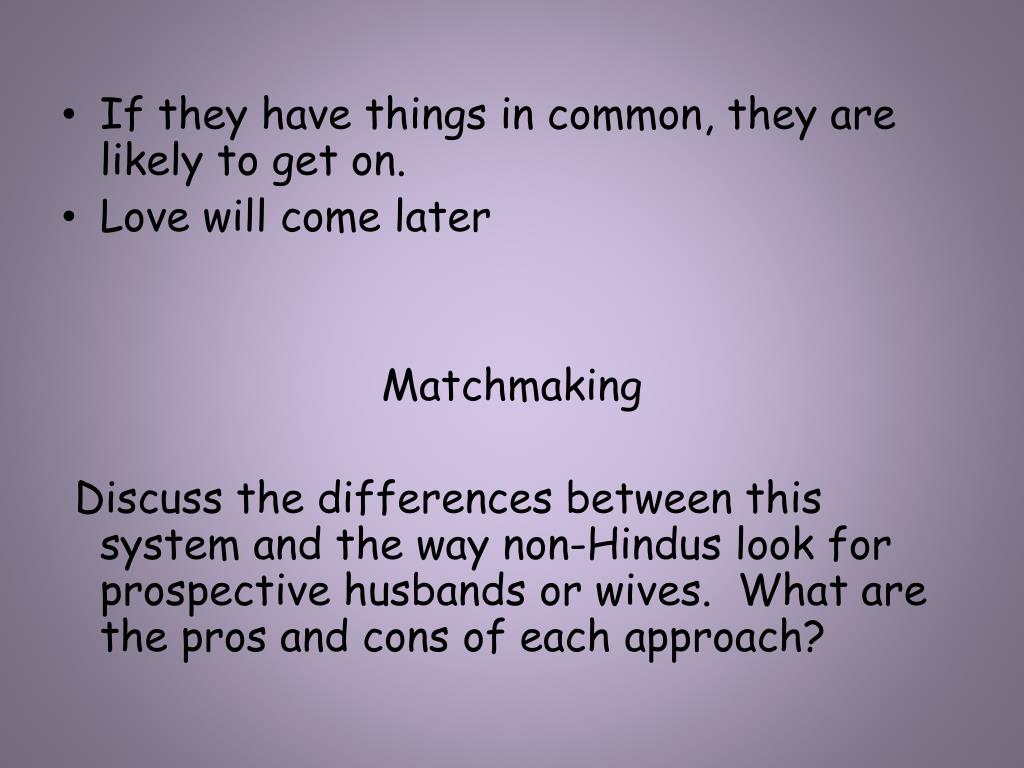 If they have things in common, they are likely to get on. • Love will come later Matchmaking Discuss the differences between this system and the way non-Hindus look for prospective husbands or wives. What are the pros and cons of each approach?