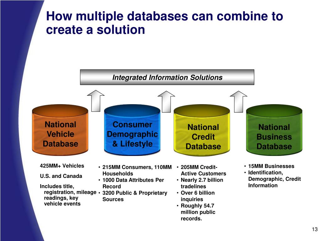 How multiple databases can combine to create a solution • 425MM+ Vehicles • U.S. and Canada • Includes title, registration, mileage readings, key vehicle events Integrated Information Solutions National Vehicle Database Consumer Demographic & Lifestyle National Credit Database National Business Database • 15MM Businesses • Identification, Demographic, Credit Information • 205MM Credit-Active Customers • Nearly 2.7 billion tradelines • Over 6 billion inquiries • Roughly 54.7 million public records. • 215MM Consumers, 110MM Households • 1000 Data Attributes Per Record • 3200 Public & Proprietary Sources