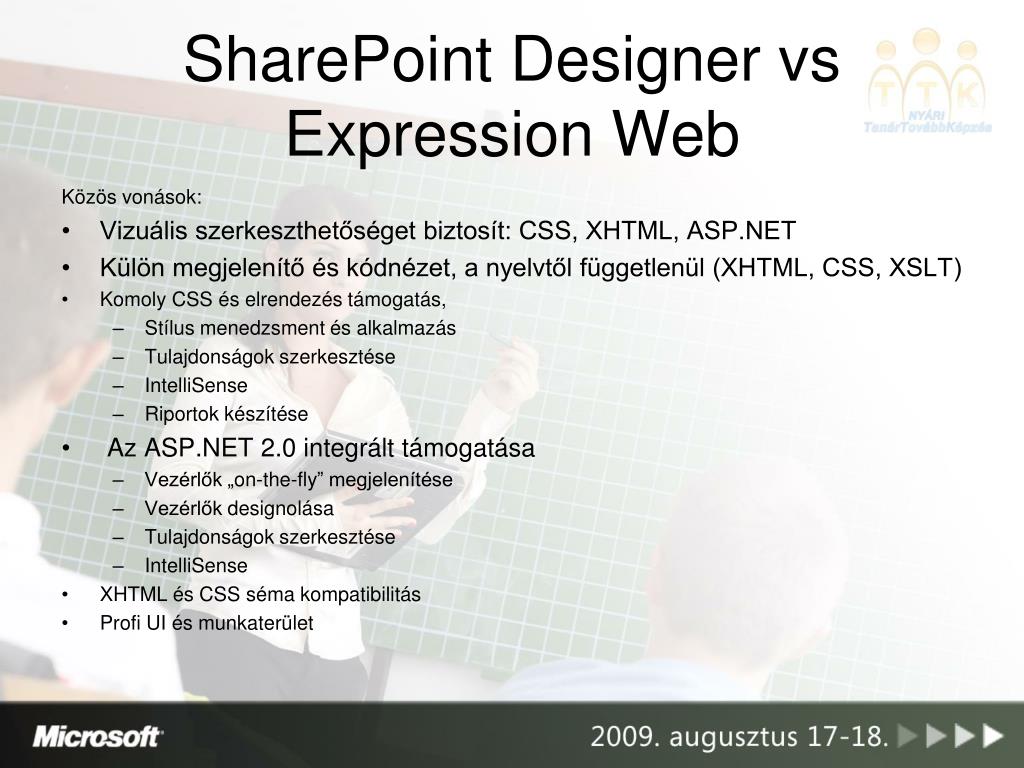 SharePoint DesignervsExpression Web Közös vonások: • Vizuális szerkeszthetőséget biztosít: CSS, XHTML, ASP.NET • Külön megjelenítő és kódnézet, a nyelvtől függetlenül (XHTML, CSS, XSLT) • Komoly CSS és elrendezés támogatás, • Stílus menedzsment és alkalmazás • Tulajdonságok szerkesztése • IntelliSense • Riportok készítése • Az ASP.NET 2.0 integrált támogatása • Vezérlők „on-the-fly” megjelenítése • Vezérlők designolása • Tulajdonságok szerkesztése • IntelliSense • XHTML és CSS séma kompatibilitás • Profi UI és munkaterület
