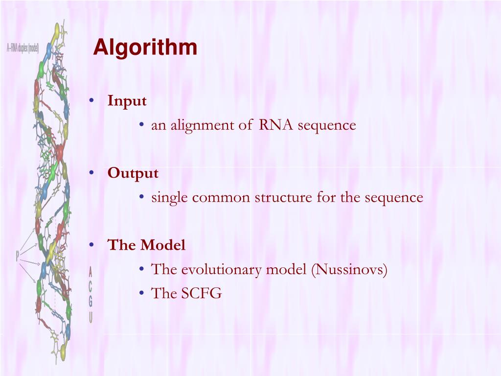 Algorithm • Input • an alignment of RNA sequence • Output • single common structure for the sequence • The Model • The evolutionary model (Nussinovs) • The SCFG