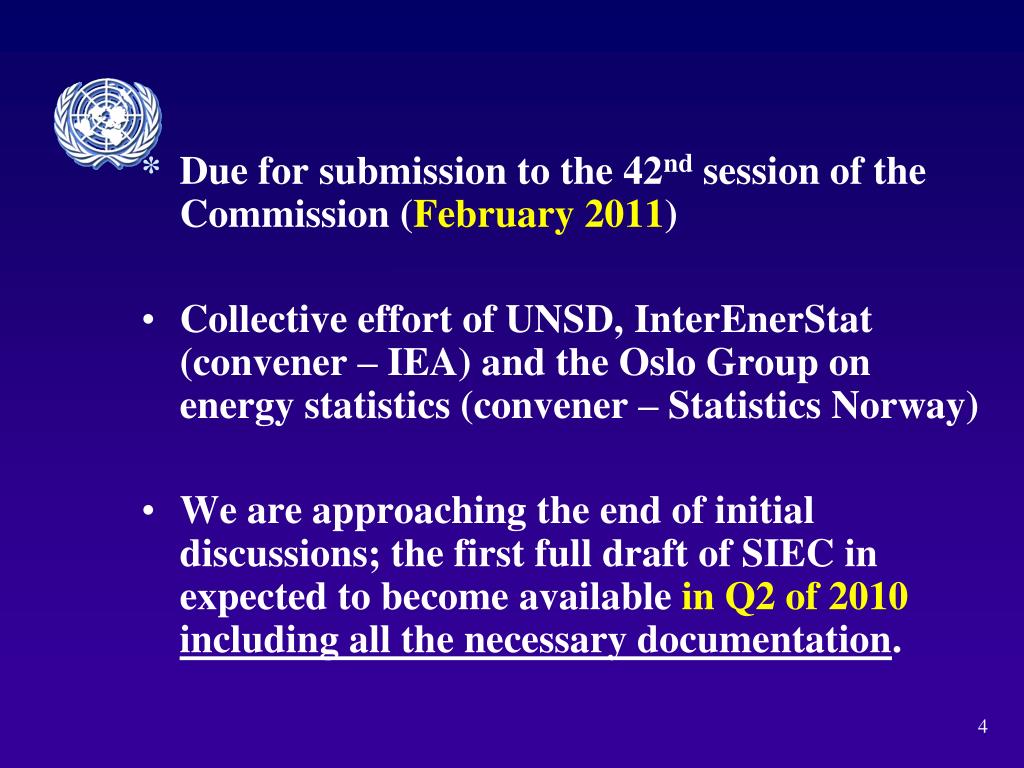 * Due for submission to the 42nd session of the Commission (February 2011) • Collective effort of UNSD, InterEnerStat (convener – IEA) and the Oslo Group on energy statistics (convener – Statistics Norway) • We are approaching the end of initial discussions; the first full draft of SIEC in expected to become available in Q2 of 2010including all the necessary documentation.
