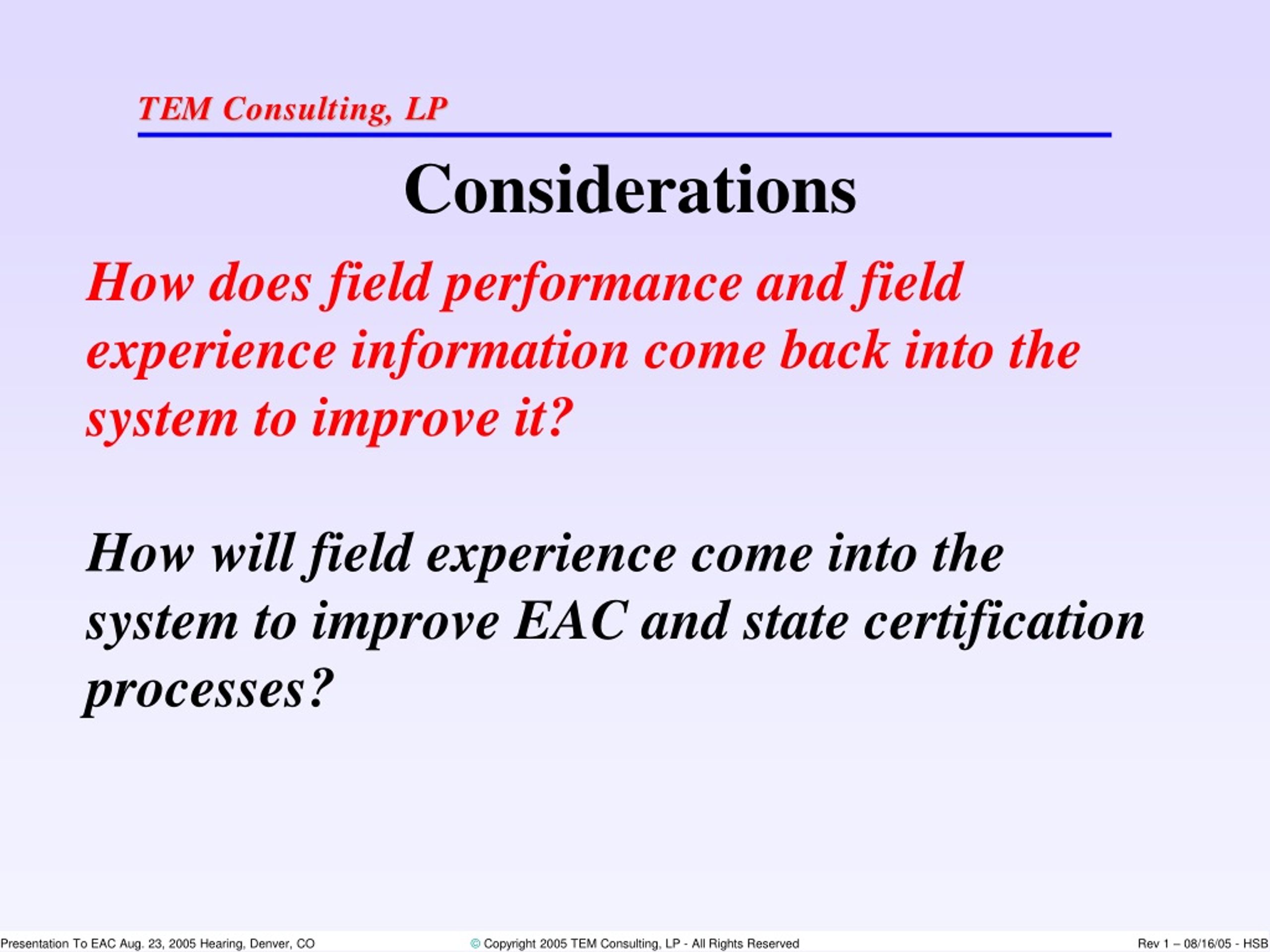 Considerations How does field performance and field experience information come back into the system to improve it? How will field experience come into the system to improve EAC and state certification processes?