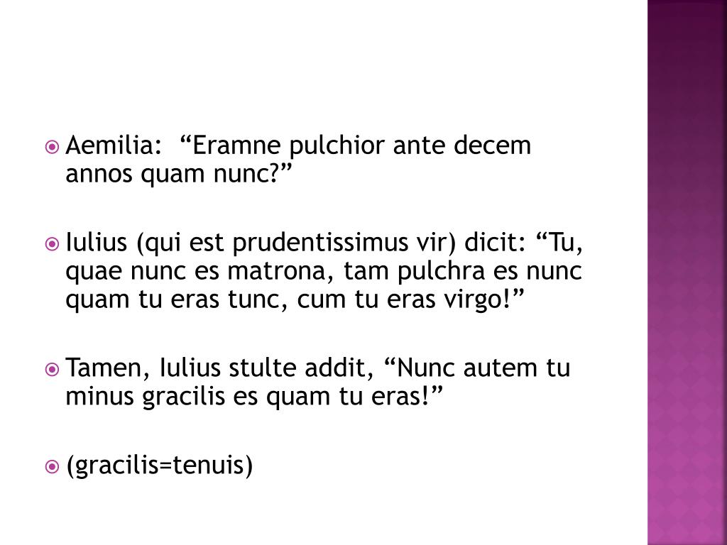 Aemilia: “Eramnepulchior ante decemannos quam nunc?” • Iulius (qui estprudentissimusvir) dicit: “Tu, quae nuncesmatrona, tam pulchraesnunc quam tu eras tunc, cum tu eras virgo!” • Tamen, Iuliusstulteaddit, “Nuncautemtu minus gracilises quam tu eras!” • (gracilis=tenuis)