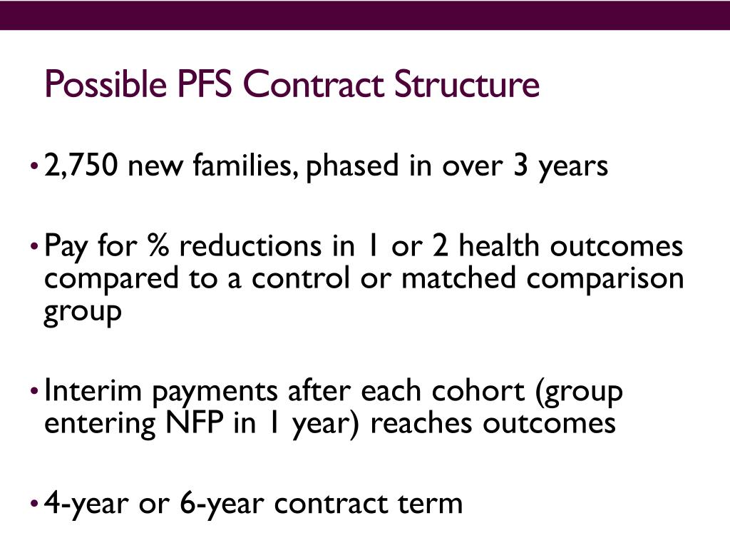 Possible PFS Contract Structure • 2,750 new families, phased in over 3 years • Pay for % reductions in 1 or 2 health outcomes compared to a control or matched comparison group • Interim payments after each cohort (group entering NFP in 1 year) reaches outcomes • 4-year or 6-year contract term