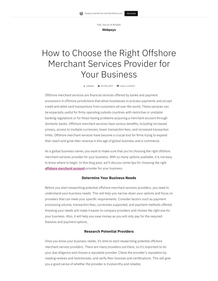 Design a site like this with WordPress.com Get started Fast, Secure & Reliable Webpays How to Choose the Right Offshore Merchant Services Provider for Your Business webpays 6th May 2023 Leave a comment Offshore merchant services are ?nancial services offered by banks and payment processors in offshore jurisdictions that allow businesses to process payments and accept credit and debit card transactions from customers all over the world. These services can be especially useful for ?rms operating outside countries with restrictive or unstable banking regulations or for those having problems acquiring a merchant account through domestic banks. Offshore merchant services have various bene?ts, including increased privacy, access to multiple currencies, lower transaction fees, and increased transaction limits. Offshore merchant services have become a crucial tool for ?rms trying to expand their reach and grow their revenue in this age of global business and e-commerce. As a global business owner, you want to make sure that you’re choosing the right offshore merchant services provider for your business. With so many options available, it is not easy to know where to begin. In this blog post, we’ll discuss some tips for choosing the right offshore merchant account provider for your business. Determine Your Business Needs Before you start researching potential offshore merchant services providers, you need to understand your business needs. This will help you narrow down your options and focus on providers that can meet your speci?c requirements. Consider factors such as payment processing volume, transaction fees, currencies supported, and payment methods offered. Knowing your needs will make it easier to compare providers and choose the right one for your business. Also, it will help you save money as you will only pay for the required features and payment options. Research Potential Providers Once you know your business needs, it’s time to start researching potential offshore merchant service providers. There are many providers out there, so it’s important to do your due diligence and choose a reputable provider. Check the provider’s reputation by reading reviews and testimonials, and verify their licenses and certi?cations. This will give you a good sense of whether the provider is trustworthy and reliable.