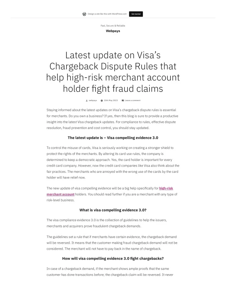 Design a site like this with WordPress.com Get started Fast, Secure & Reliable Webpays Latest update on Visa’s Chargeback Dispute Rules that help high-risk merchant account holder ?ght fraud claims webpays 15th May 2023 Leave a comment Staying informed about the latest updates on Visa’s chargeback dispute rules is essential for merchants. Do you own a business? If yes, then this blog is sure to provide a productive insight into the latest Visa chargeback updates. For compliance to rules, effective dispute resolution, fraud prevention and cost control, you should stay updated. The latest update is – Visa compelling evidence 3.0 To control the misuse of cards, Visa is seriously working on creating a stronger shield to protect the rights of the merchants. By altering its card use rules, the company is determined to keep a democratic approach. Yes, the card holder is important for every credit card company. However, now the credit card companies like Visa also think about the fair practices. The merchants who are annoyed with the wrong use of the cards by the card holder will have relief now. The new update of visa compelling evidence will be a big help speci?cally for high-risk merchant account holders. You should read further if you are a merchant with any type of risk-level business. What is visa compelling evidence 3.0? The visa compliance evidence 3.0 is the collection of guidelines to help the issuers, merchants and acquirers prove fraudulent chargeback demands. The guidelines set a rule that if merchants have certain evidence, the chargeback demand will be reversed. It means that the customer making fraud chargeback demand will not be considered. The merchant will not have to pay back in the name of chargeback. How will visa compelling evidence 3.0 ?ght chargebacks? In case of a chargeback demand, if the merchant shows ample proofs that the same customer has done transactions before; the chargeback claim will be reversed. It never