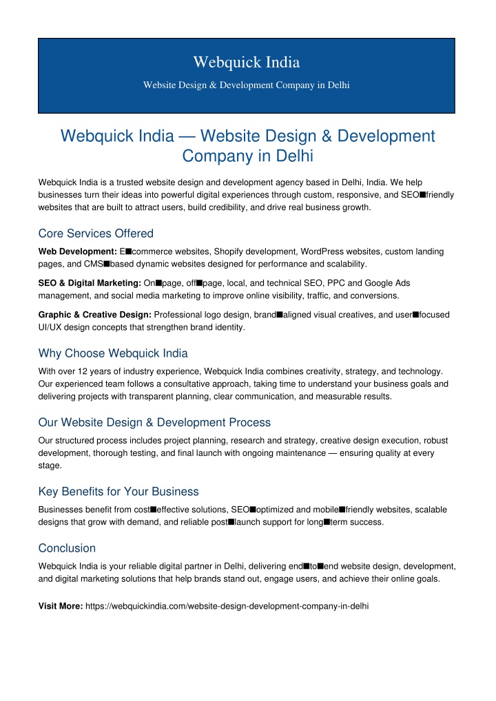 Webquick India Website Design & Development Company in Delhi Webquick India — Website Design & Development Company in Delhi Webquick India is a trusted website design and development agency based in Delhi, India. We help businesses turn their ideas into powerful digital experiences through custom, responsive, and SEOIfriendly websites that are built to attract users, build credibility, and drive real business growth. Core Services Offered Web Development: EIcommerce websites, Shopify development, WordPress websites, custom landing pages, and CMSIbased dynamic websites designed for performance and scalability. SEO & Digital Marketing: OnIpage, offIpage, local, and technical SEO, PPC and Google Ads management, and social media marketing to improve online visibility, traffic, and conversions. Graphic & Creative Design: Professional logo design, brandIaligned visual creatives, and userIfocused UI/UX design concepts that strengthen brand identity. Why Choose Webquick India With over 12 years of industry experience, Webquick India combines creativity, strategy, and technology. Our experienced team follows a consultative approach, taking time to understand your business goals and delivering projects with transparent planning, clear communication, and measurable results. Our Website Design & Development Process Our structured process includes project planning, research and strategy, creative design execution, robust development, thorough testing, and final launch with ongoing maintenance — ensuring quality at every stage. Key Benefits for Your Business Businesses benefit from costIeffective solutions, SEOIoptimized and mobileIfriendly websites, scalable designs that grow with demand, and reliable postIlaunch support for longIterm success. Conclusion Webquick India is your reliable digital partner in Delhi, delivering endItoIend website design, development, and digital marketing solutions that help brands stand out, engage users, and achieve their online goals. Visit More: https://webquickindia.com/website-design-development-company-in-delhi