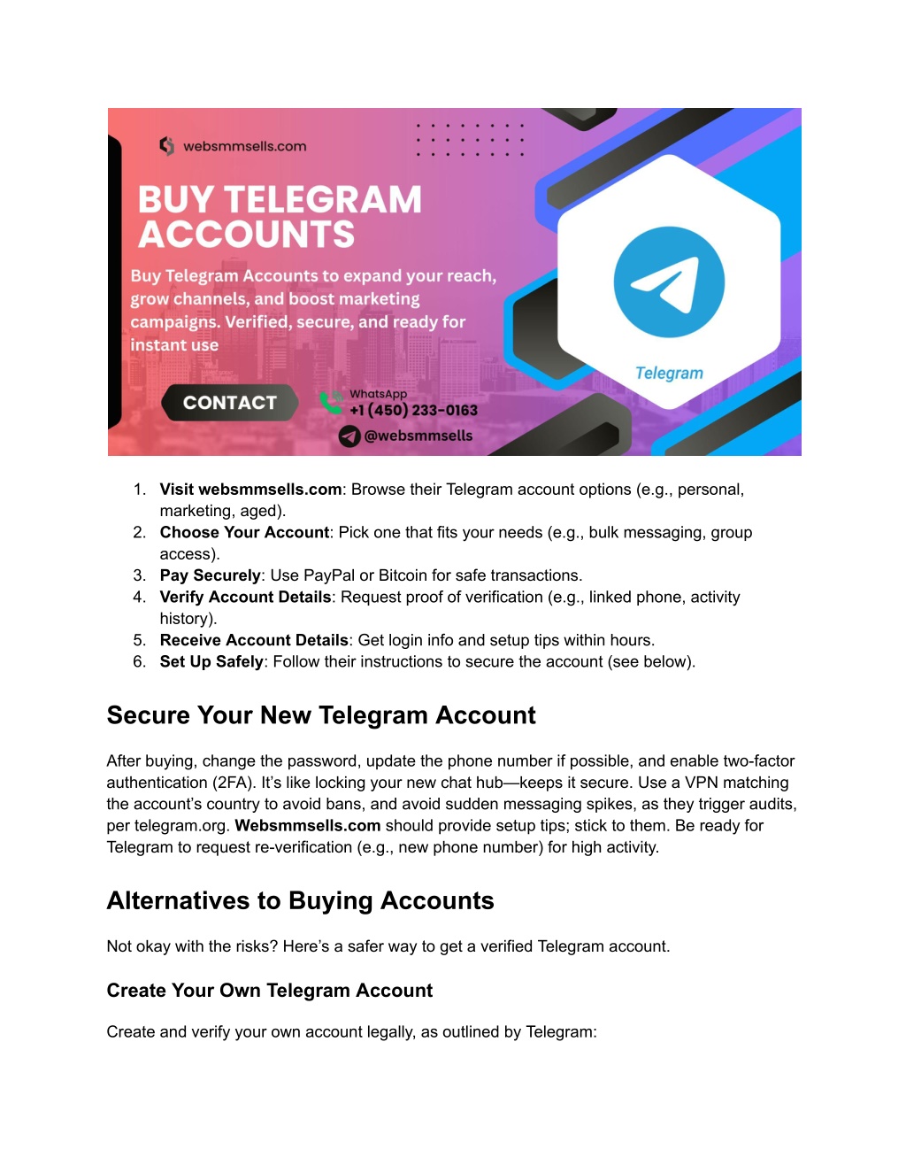 Verifying a Telegram account requires a phone number, which can fail with virtual numbers and take hours, per quora.com. Websmmsells.com hands you a pre-verified account, ready to roll. It’s like grabbing a smoothie instead of blending—you’re messaging faster, but is it worth the gamble? Risks of Buying Telegram Accounts Let’s be honest—buying Telegram accounts is like playing with fire. It’s against Telegram’s Terms of Service, which ban account trading to prevent spam and fraud, and could lead to bans. Scams are a huge threat, too. Here’s what you’re risking in 2025. Telegram’s No-Trade Policy Telegram prohibits buying or selling accounts, using phone verification and algorithms to detect suspicious activity, per telegram.org. If caught, accounts can be banned, like getting locked out of a club. A 2025 Reddit post reported losing access to a 10,000-member channel due to a banned purchased account, per quora.com. Fraudulent activity could also attract legal scrutiny under data protection laws. Websmmsells.com may offer “safe” accounts, but Telegram’s detection (e.g., IP tracking, activity audits) is relentless. Avoiding Scams in 2025 Some sellers push fake or recycled accounts, like selling a “new” gadget that’s junk. Quora posts warn of $5–$200 accounts that lock up fast, per quora.com. Websmmsells.com promises legit accounts, secure payments (PayPal, Bitcoin), and a 48-hour replacement guarantee. To dodge scams, check Reddit reviews, request proof (e.g., group screenshots), and use escrow services, per slideshare.net. Never share your OTP code, as scammers can hijack accounts. Scams can derail your campaigns and expose your data. How to Buy Safely from websmmsells.com If you’re set on buying from websmmsells.com, here’s how to stay as safe as possible—though creating your own account is smarter.