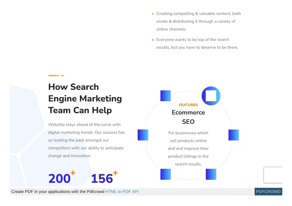 Creating compelling & valuable content, both onsite & distributing it through a variety of online channels. Everyone wants to be top of the search results, but you have to deserve to be there. How Search Engine Marketing Team Can Help FEATURES Ecommerce SEO Webzilla stays ahead of the curve with digital marketing trends. Our success has For businesses which us leading the pack amongst our sell products online competitors with our ability to anticipate and and improve their change and innovation. product listings in the search results. 200+ 156+ Create PDF in your applications with the Pdfcrowd HTML to PDF API PDFCROWD