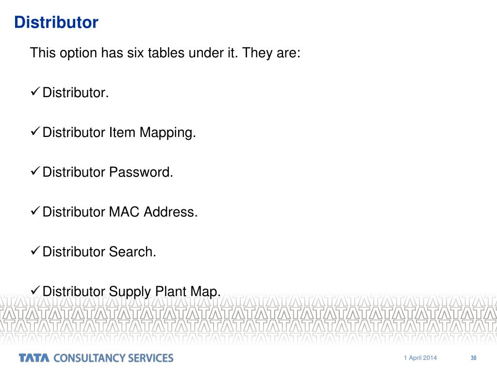 Distributor This option has six tables under it. They are: Distributor. Distributor Item Mapping. Distributor Password. Distributor MAC Address. Distributor Search. Distributor Supply Plant Map. 30