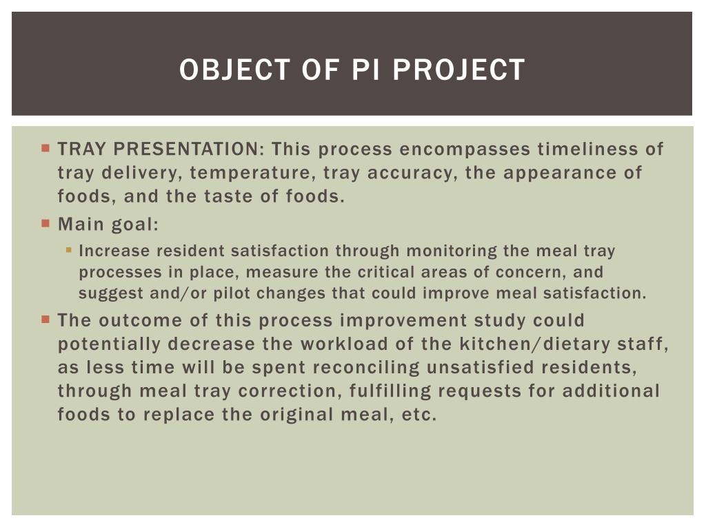 Object of pi project • TRAY PRESENTATION: This process encompasses timeliness of tray delivery, temperature, tray accuracy, the appearance of foods, and the taste of foods. • Main goal: • Increase resident satisfaction through monitoring the meal tray processes in place, measure the critical areas of concern, and suggest and/or pilot changes that could improve meal satisfaction. • The outcome of this process improvement study could potentially decrease the workload of the kitchen/dietary staff, as less time will be spent reconciling unsatisfied residents, through meal tray correction, fulfilling requests for additional foods to replace the original meal, etc.