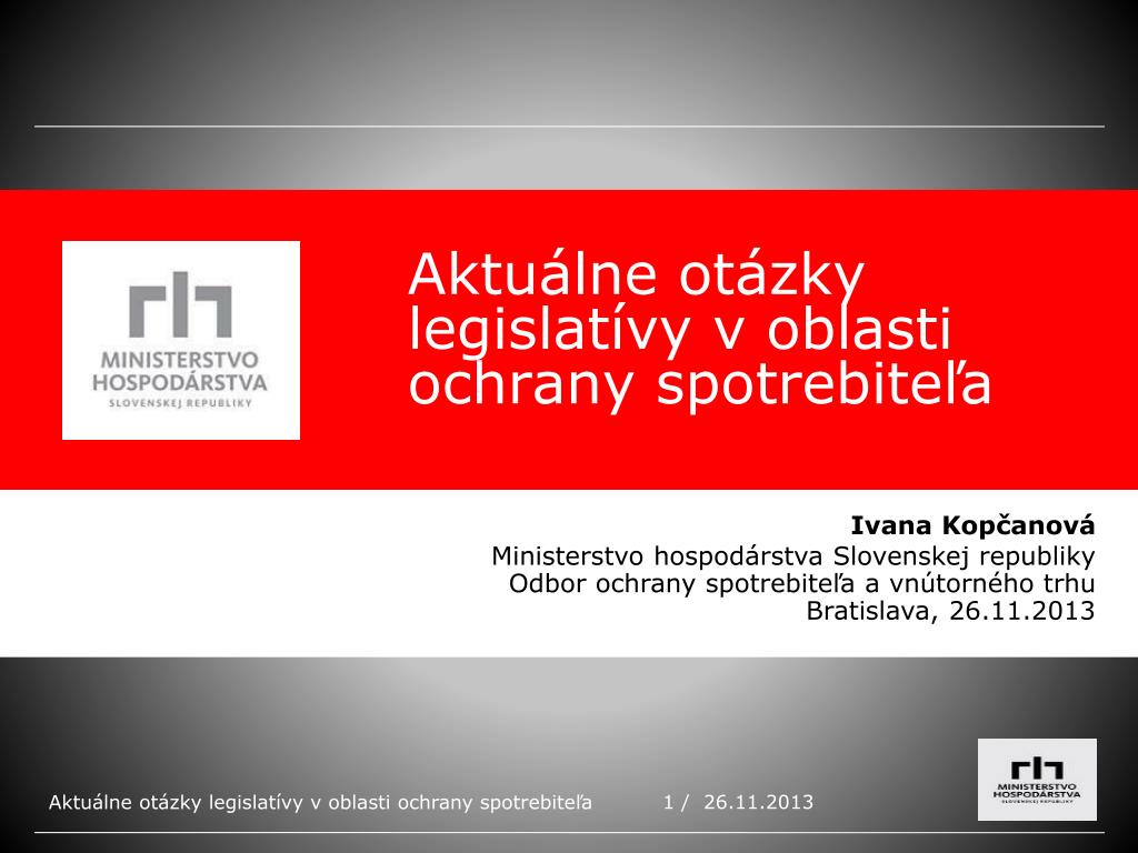 Aktuálne otázky legislatívy v oblasti ochrany spotrebiteľa Ivana Kopčanová Ministerstvo hospodárstva Slovenskej republiky Odbor ochrany spotrebiteľa a vnútorného trhu Bratislava, 26.11.2013