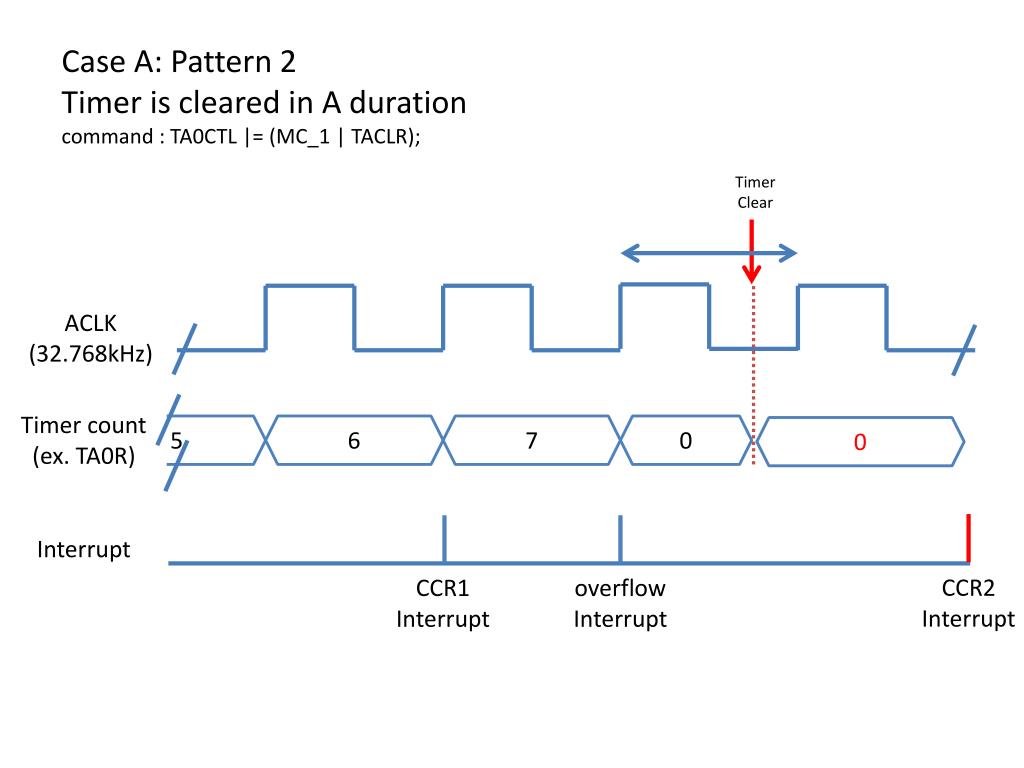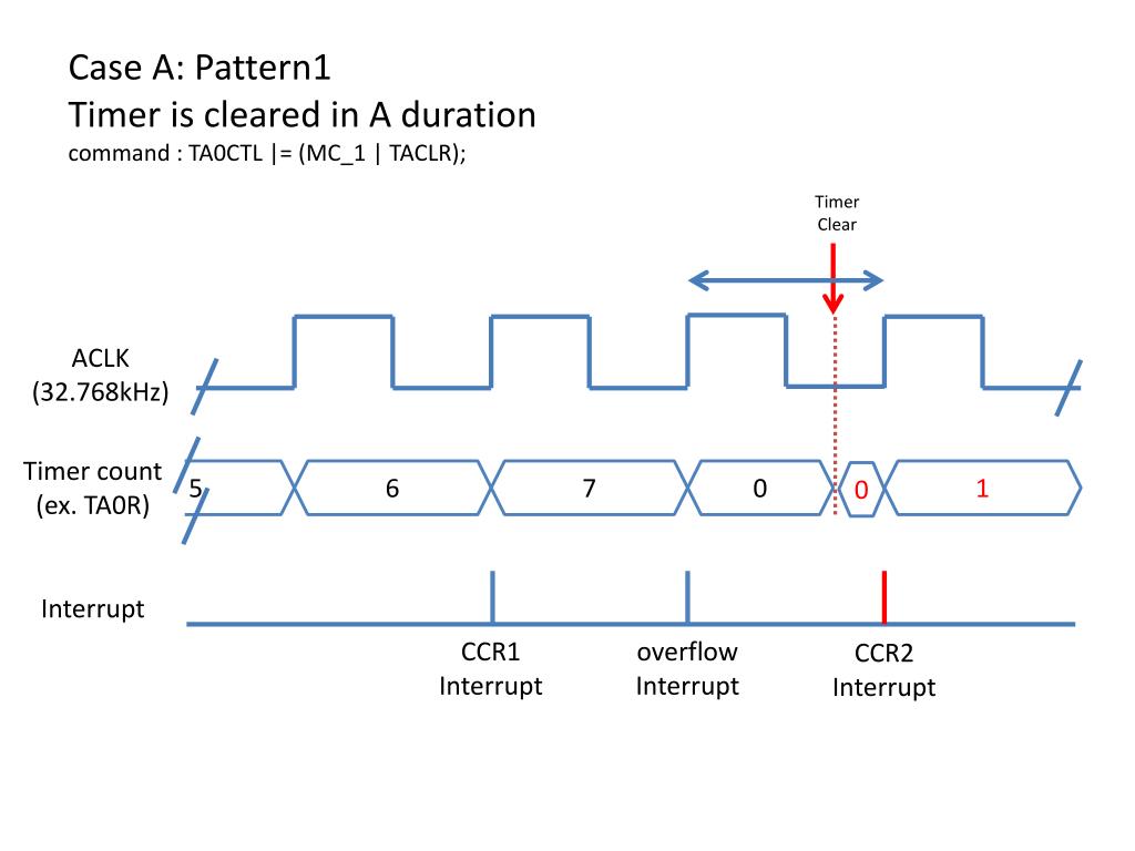 Case A: Pattern 2Timer is cleared in A duration command : TA0CTL |= (MC_1 | TACLR); Timer Clear ACLK (32.768kHz) Timer count (ex. TA0R) 5 6 7 0 0 Interrupt CCR2 Interrupt CCR1 Interrupt overflow Interrupt