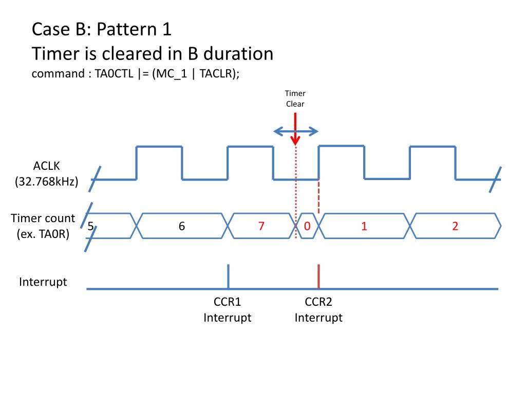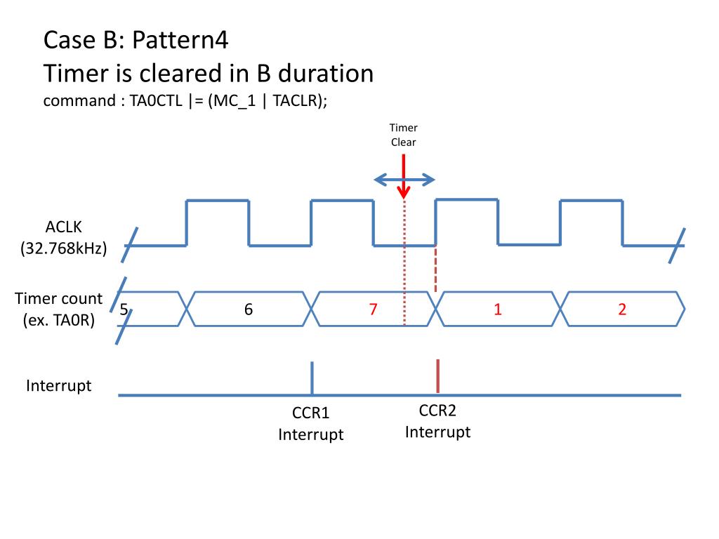 Case B: Pattern4Timer is cleared in B duration command : TA0CTL |= (MC_1 | TACLR); Timer Clear ACLK (32.768kHz) Timer count (ex. TA0R) 5 6 7 1 2 Interrupt CCR2 Interrupt CCR1 Interrupt