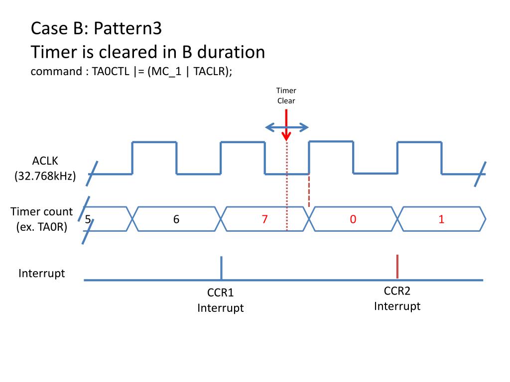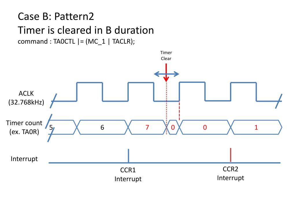 Case C: Pattern 2Timer is cleared in C duration command : TA0CTL |= (MC_1 | TACLR); Timer Clear ACLK (32.768kHz) Timer count (ex. TA0R) 0 5 6 7 0 1 Interrupt CCR2 Interrupt CCR1 Interrupt