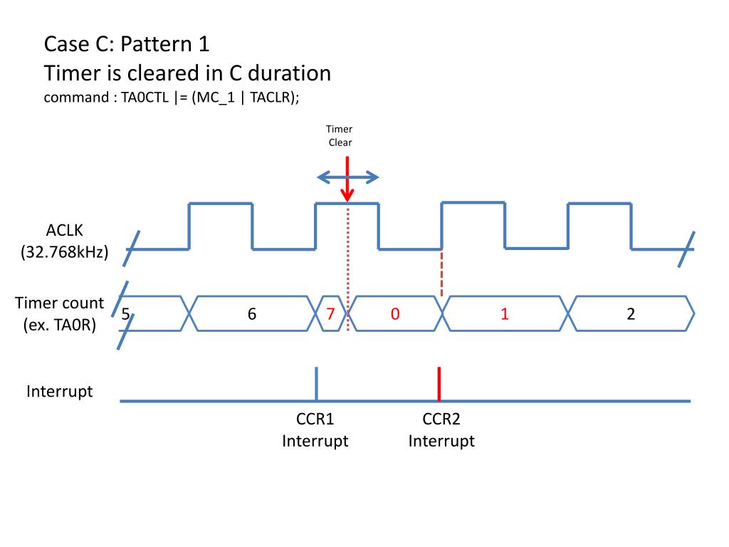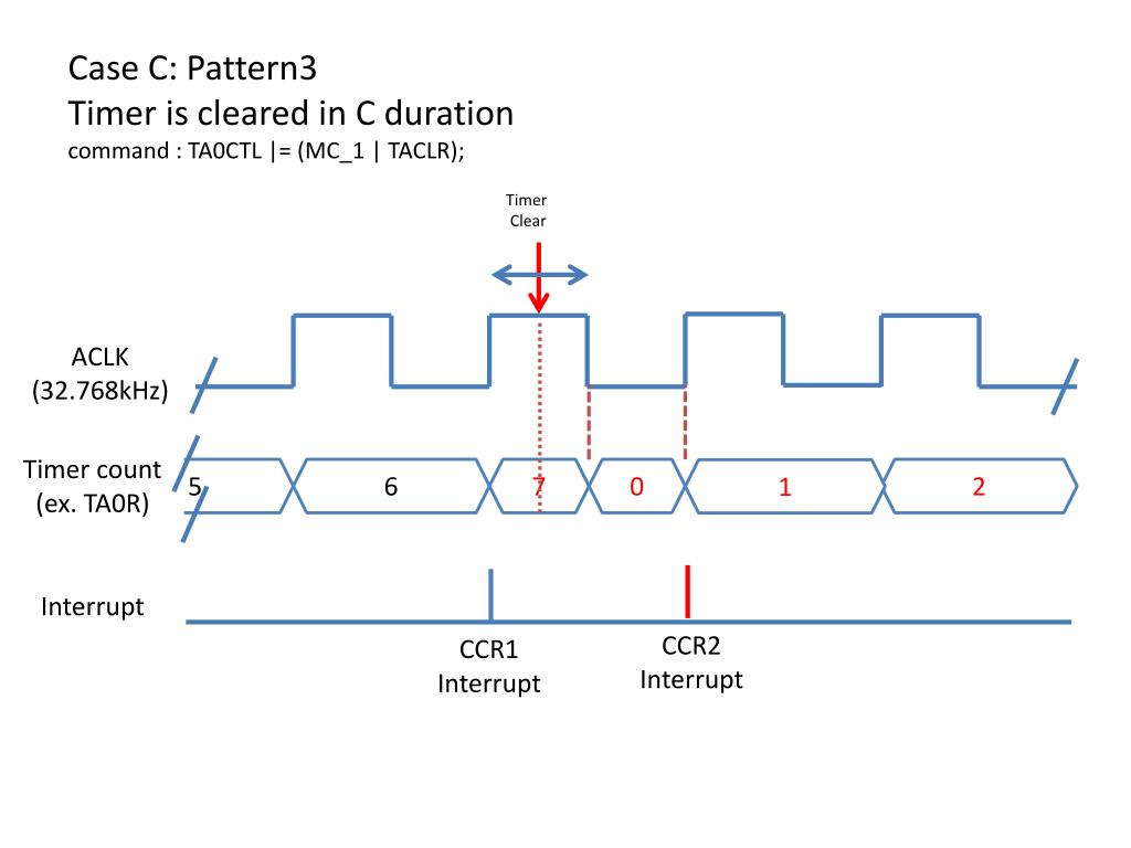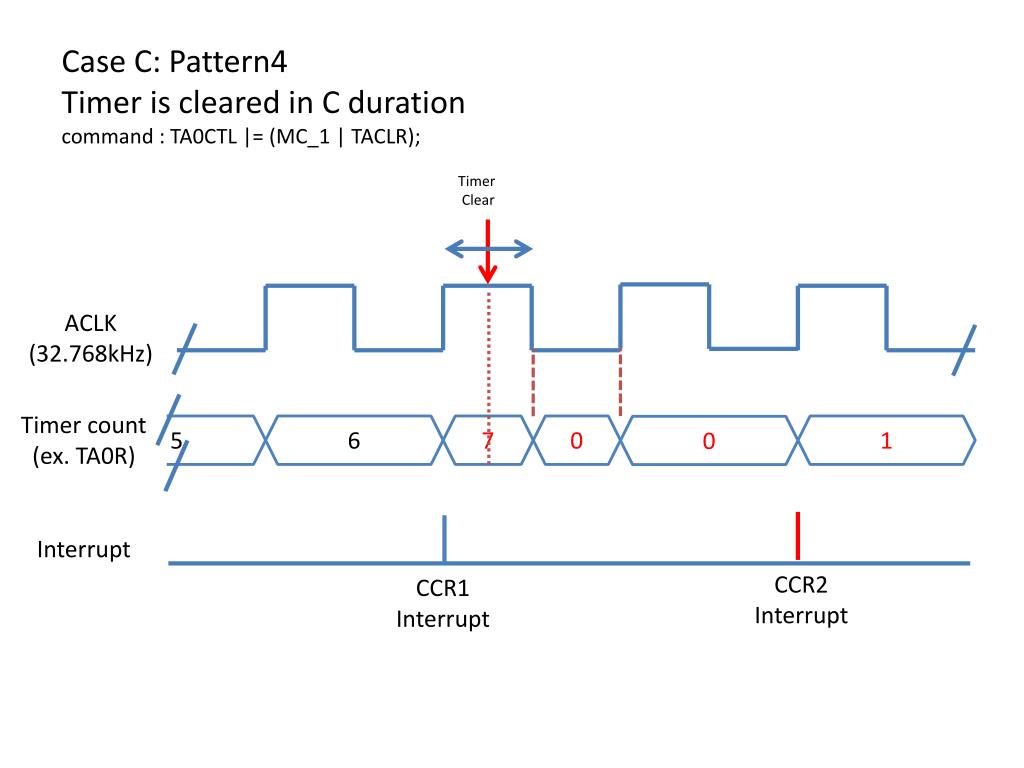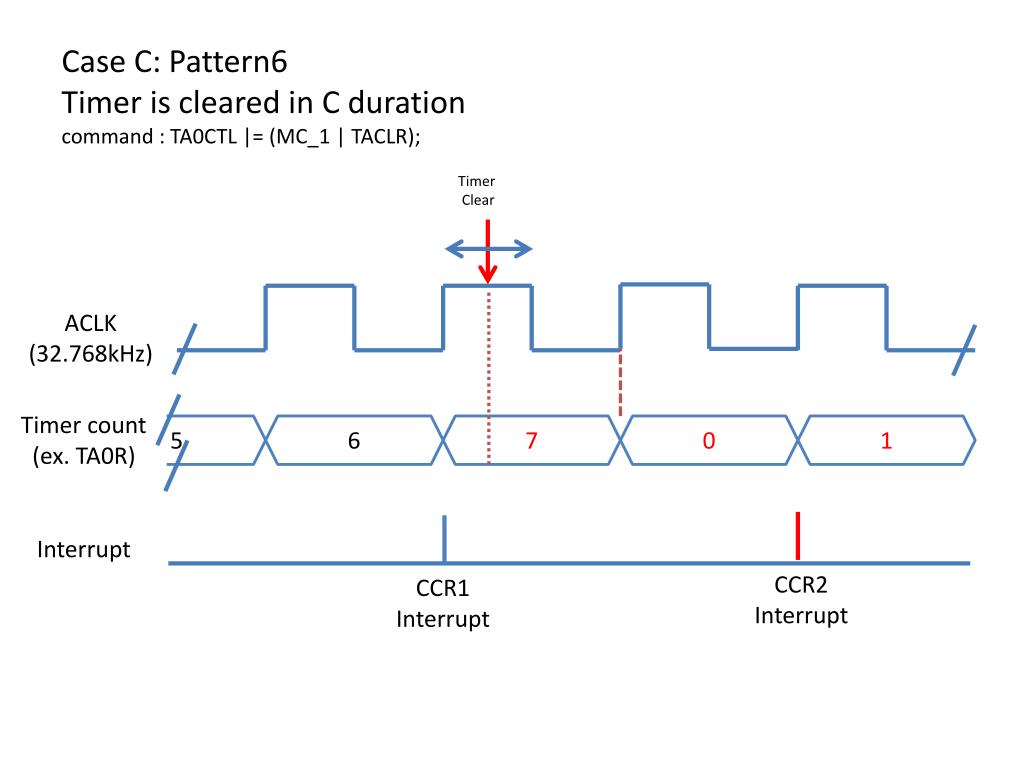 Case C: Pattern6Timer is cleared in C duration command : TA0CTL |= (MC_1 | TACLR); Timer Clear ACLK (32.768kHz) Timer count (ex. TA0R) 5 6 7 0 1 Interrupt CCR2 Interrupt CCR1 Interrupt