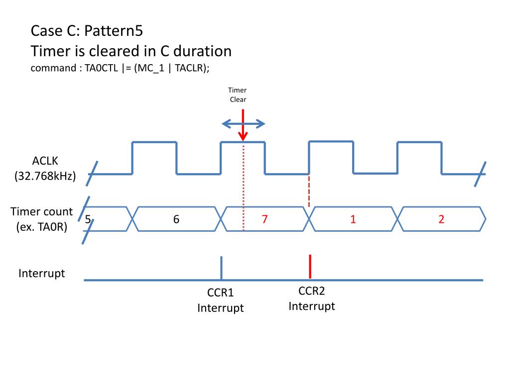 Case C: Pattern5Timer is cleared in C duration command : TA0CTL |= (MC_1 | TACLR); Timer Clear ACLK (32.768kHz) Timer count (ex. TA0R) 5 6 7 1 2 Interrupt CCR2 Interrupt CCR1 Interrupt
