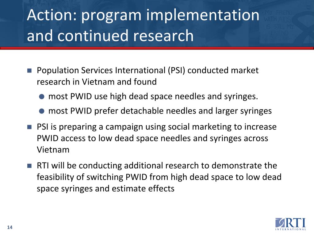Action: program implementation and continued research • Population Services International (PSI) conducted market research in Vietnam and found • most PWID use high dead space needles and syringes. • most PWID prefer detachable needles and larger syringes • PSI is preparing a campaign using social marketing to increase PWID access to low dead space needles and syringes across Vietnam • RTI will be conducting additional research to demonstrate the feasibility of switching PWID from high dead space to low dead space syringes and estimate effects