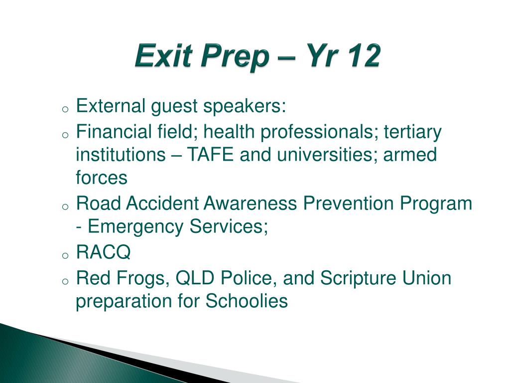 Exit Prep – Yr 12 • External guest speakers: • Financial field; health professionals; tertiary institutions – TAFE and universities; armed forces • Road Accident Awareness Prevention Program - Emergency Services; • RACQ • Red Frogs, QLD Police, and Scripture Union preparation for Schoolies