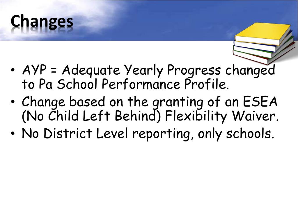 Changes • AYP = Adequate Yearly Progress changed to Pa School Performance Profile. • Change based on the granting of an ESEA (No Child Left Behind) Flexibility Waiver. • No District Level reporting, only schools.