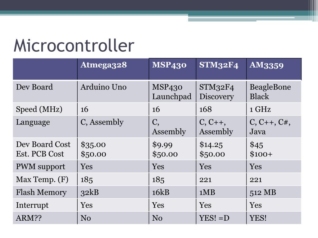 STM32F407VGT6 • ARM 32 bit Cortex M4F • PWM for motor control and Plenty of GPIO available (82) • Low power modes • Serial Wire and JTAG interfaces for debugging • External Interrupt/Event Controller