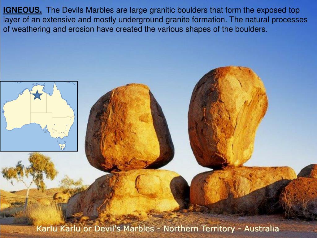 IGNEOUS. The Devils Marbles are large granitic boulders that form the exposed top layer of an extensive and mostly underground granite formation. The natural processes of weathering and erosion have created the various shapes of the boulders. KarluKarluorDevil'sMarbles - NorthernTerritory - Australia