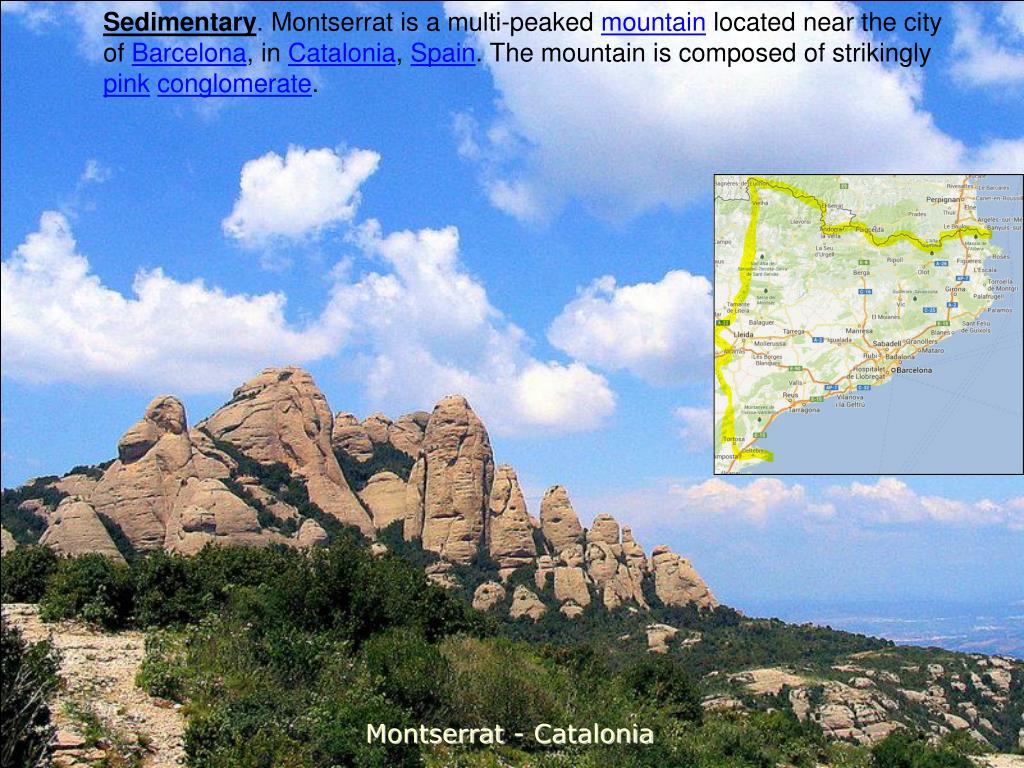 Sedimentary. Montserrat is a multi-peaked mountain located near the city of Barcelona, in Catalonia, Spain. The mountain is composed of strikingly pinkconglomerate. Montserrat - Catalonia