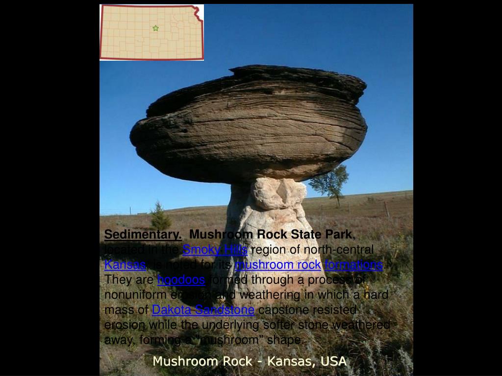 Sedimentary. Mushroom Rock State Park, located in the Smoky Hills region of north-central Kansas, is noted for its mushroom rockformations. They are hoodoos formed through a process of nonuniform erosion and weathering in which a hard mass of Dakota Sandstone capstone resisted erosion while the underlying softer stone weathered away, forming a "mushroom" shape. Mushroom Rock - Kansas, USA