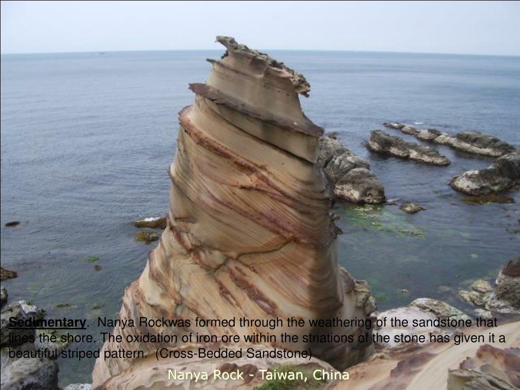Sedimentary. Nanya Rockwas formed through the weathering of the sandstone that lines the shore. The oxidation of iron ore within the striations of the stone has given it a beautiful striped pattern. (Cross-Bedded Sandstone) Nanya Rock - Taiwan, China