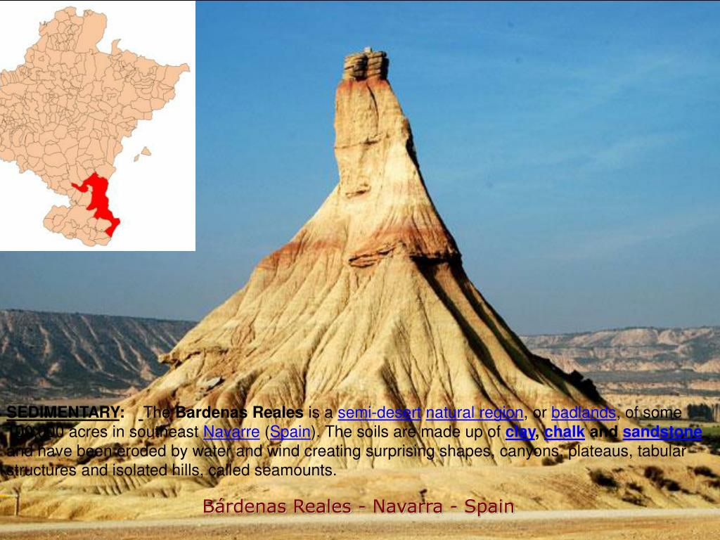 SEDIMENTARY: The Bardenas Reales is a semi-desertnatural region, or badlands, of some 100,000 acres in southeast Navarre (Spain). The soils are made up of clay, chalk and sandstoneand have been eroded by water and wind creating surprising shapes, canyons, plateaus, tabular structures and isolated hills, called seamounts. Bárdenas Reales - Navarra - Spain