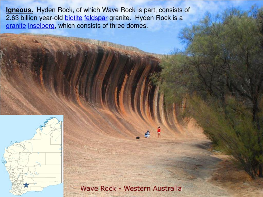 Igneous. Hyden Rock, of which Wave Rock is part, consists of 2.63 billion year-old biotitefeldspar granite. Hyden Rock is a graniteinselberg, which consists of three domes. Wave Rock - Western Australia
