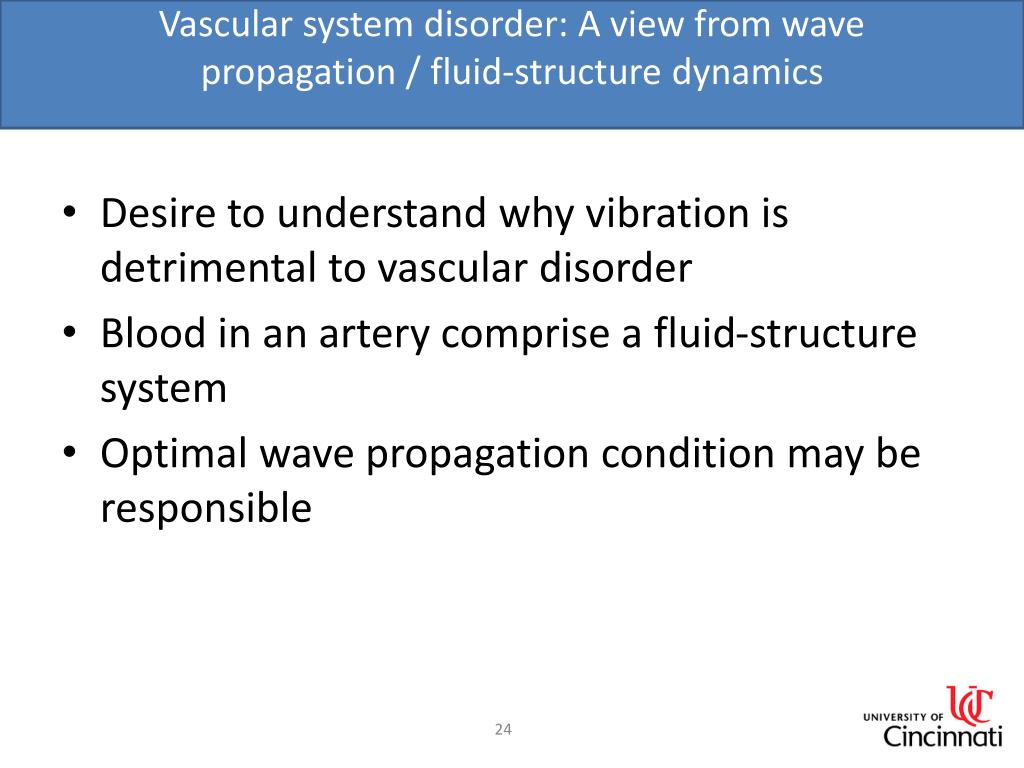 Vascular system disorder: A view from wave propagation / fluid-structure dynamics Desire to understand why vibration is detrimental to vascular disorder Blood in an artery comprise a fluid-structure system Optimal wave propagation condition may be responsible