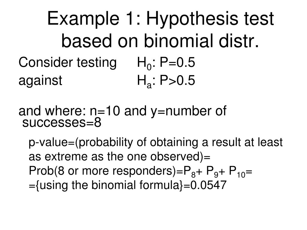 Example 1: Hypothesis test based on binomial distr. Consider testing H0: P=0.5 against Ha: P>0.5 and where: n=10 and y=number of successes=8 p-value=(probability of obtaining a result at least as extreme as the one observed)=Prob(8 or more responders)=P8+ P9+ P10=={using the binomial formula}=0.0547