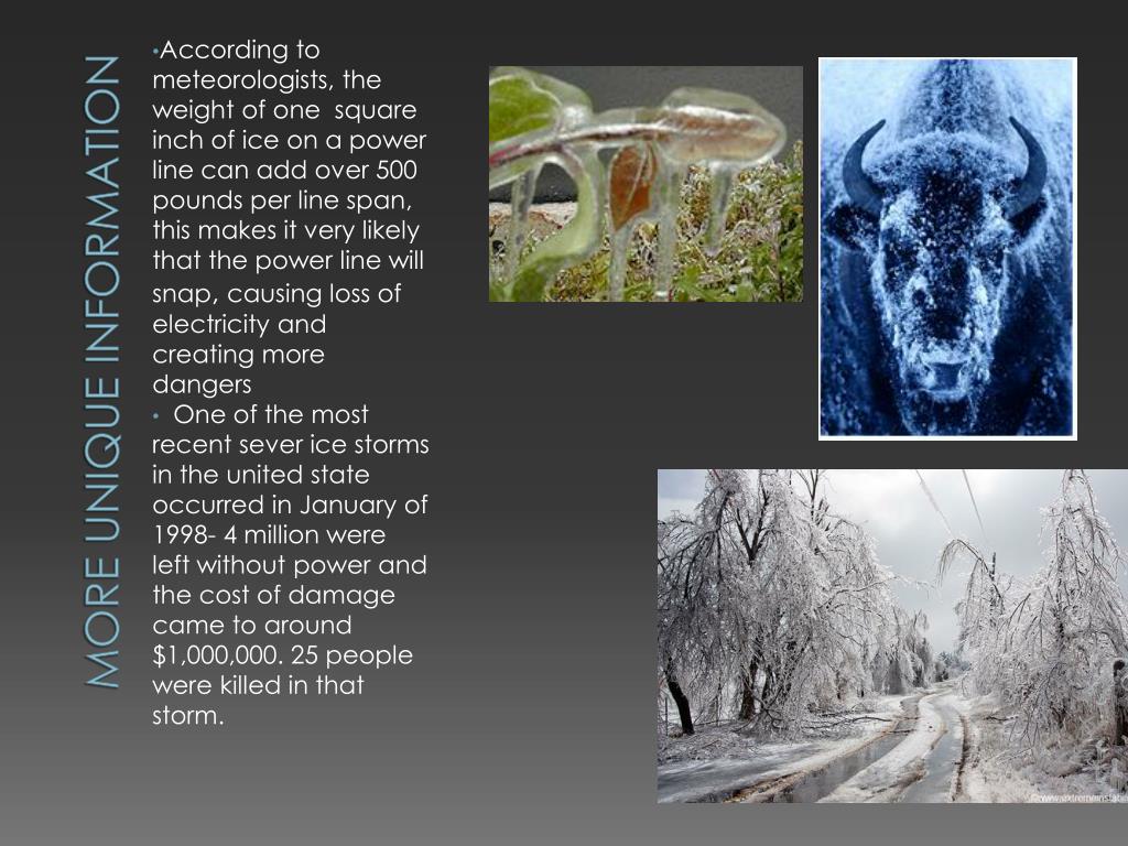 More unique information According to meteorologists, the weight of one square inch of ice on a power line can add over 500 pounds per line span, this makes it very likely that the power line will snap, causing loss of electricity and creating more dangers One of the most recent sever ice storms in the united state occurred in January of 1998- 4 million were left without power and the cost of damage came to around $1,000,000. 25 people were killed in that storm.