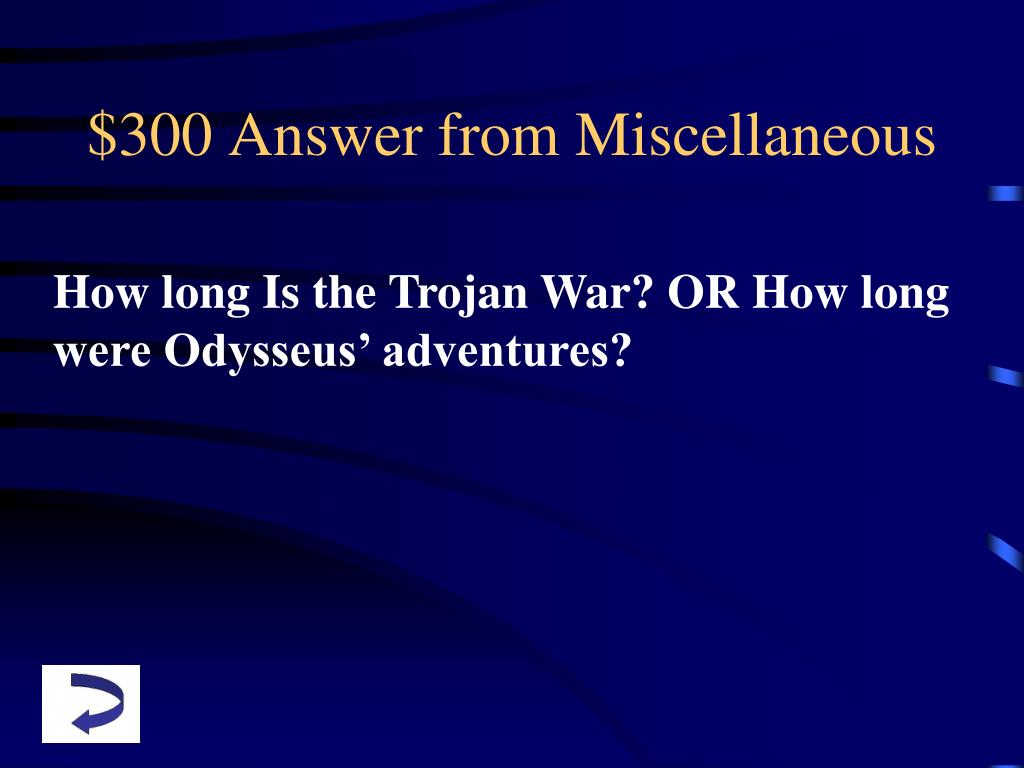 $300 Answer from Miscellaneous How long Is the Trojan War? OR How long were Odysseus’ adventures?