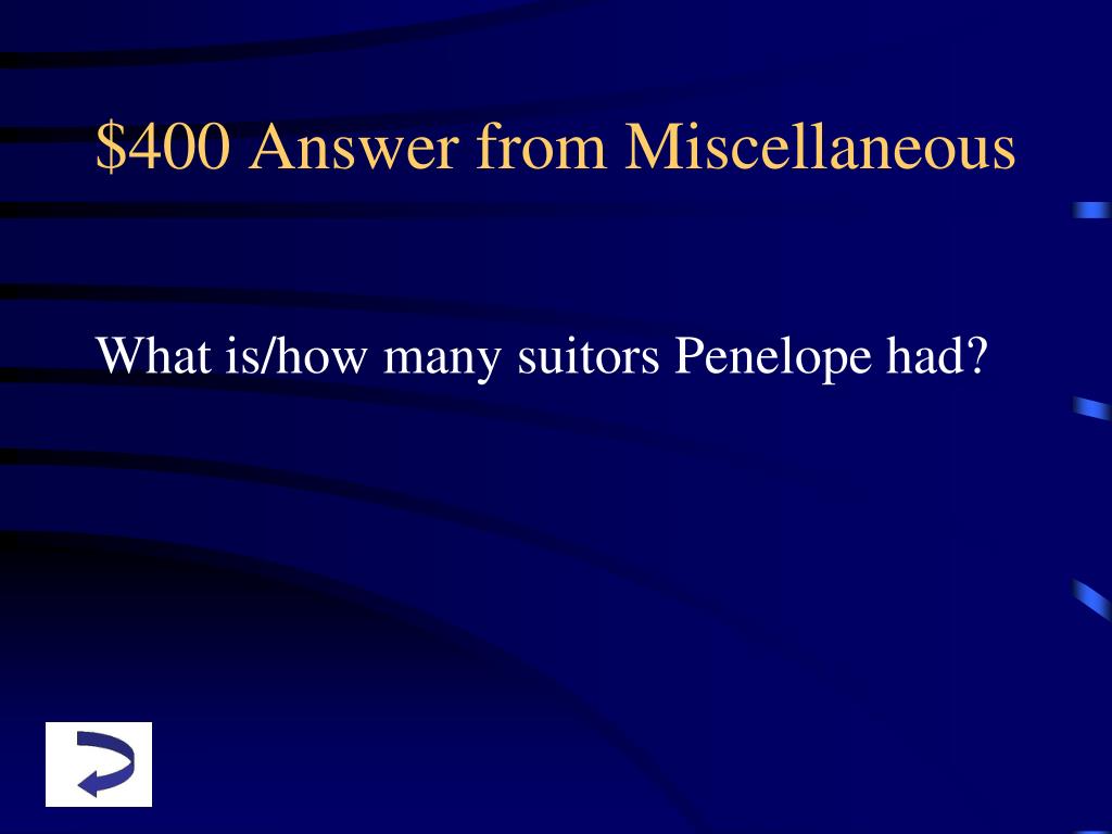$400 Answer from Miscellaneous What is/how many suitors Penelope had?