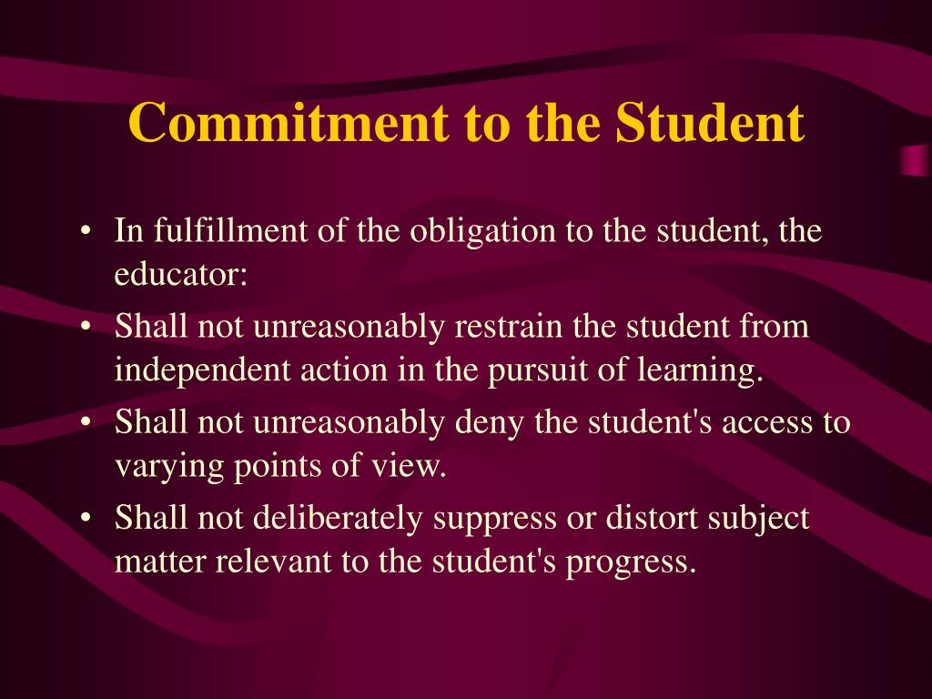 Commitment to the Student • In fulfillment of the obligation to the student, the educator: • Shall not unreasonably restrain the student from independent action in the pursuit of learning. • Shall not unreasonably deny the student's access to varying points of view. • Shall not deliberately suppress or distort subject matter relevant to the student's progress.