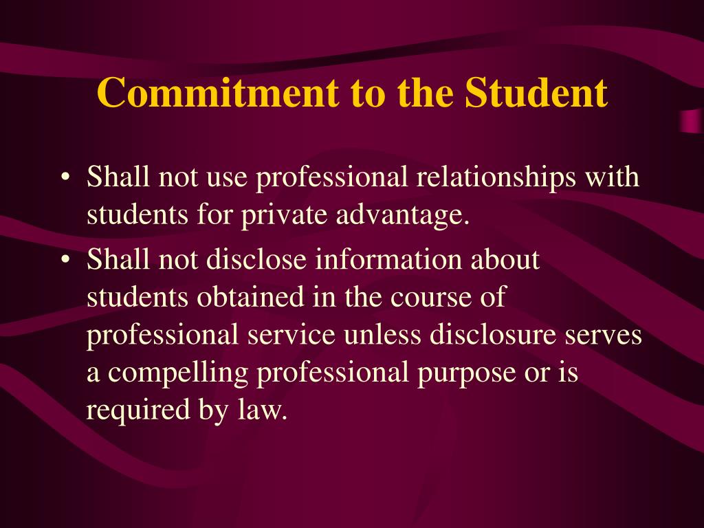 Commitment to the Student • Shall not use professional relationships with students for private advantage. • Shall not disclose information about students obtained in the course of professional service unless disclosure serves a compelling professional purpose or is required by law.