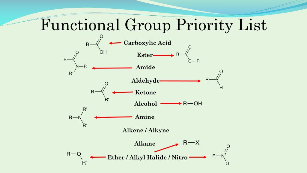 Functional Group Priority List Carboxylic Acid Ester Amide Aldehyde Ketone Alcohol Amine Alkene / Alkyne Alkane Ether / Alkyl Halide / Nitro