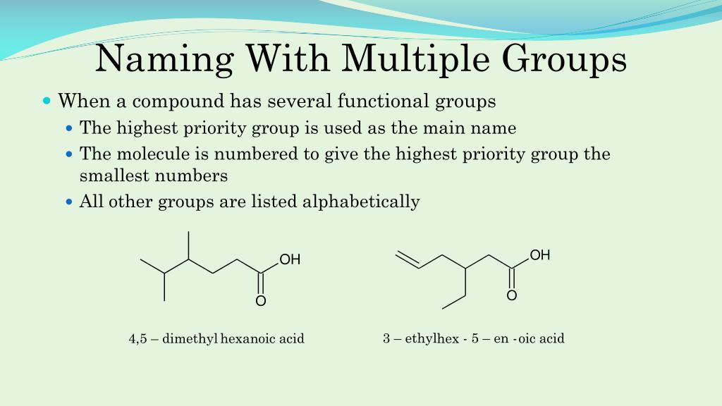Naming With Multiple Groups • When a compound has several functional groups • The highest priority group is used as the main name • The molecule is numbered to give the highest priority group the smallest numbers • All other groups are listed alphabetically 3 – ethyl - 5 – en - oic acid hex 4,5 – dimethyl hexanoic acid
